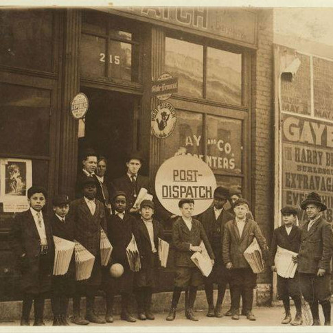 In 1903, Lewis Wickes Hine traveled around the country documenting these child laborers. Included in his photography were the St. Louis newsboys. These children, many of them orphans, were being used as foot soldiers of the newspaper rivalry. In an era before the internet, nationwide events were front page news and most downtown St. Louisans got these updates during their daily morning routine... via a newsboy on the way to work. Boys, from many different backgrounds and languages, battled for these turf street corners, sometimes physically. They smoked cigarettes and gambled. They were not able to go to school to learn how to read and write, making labor jobs the only jobs for their future. By advocating for the education of these children and (soon-to-be future adult citizens), activists demanded that they be educated so that they would be valuable to society as adults.